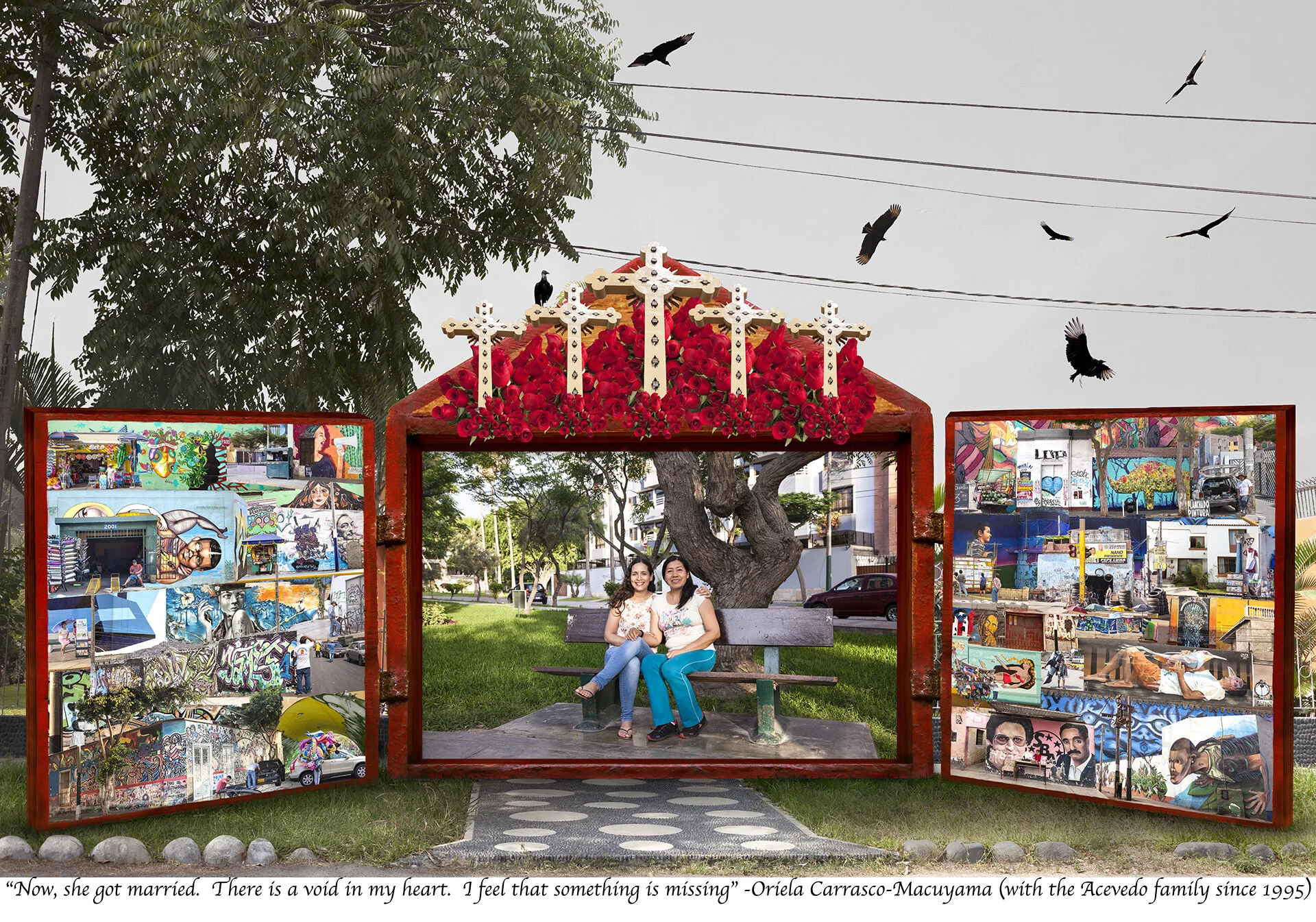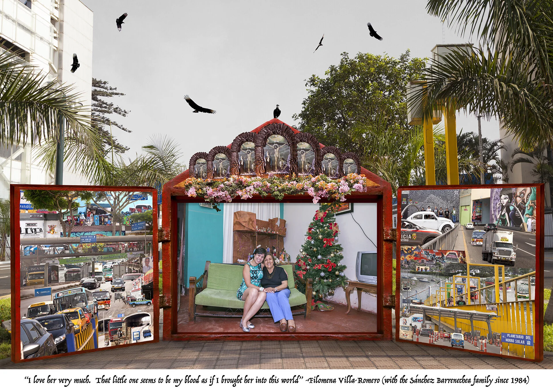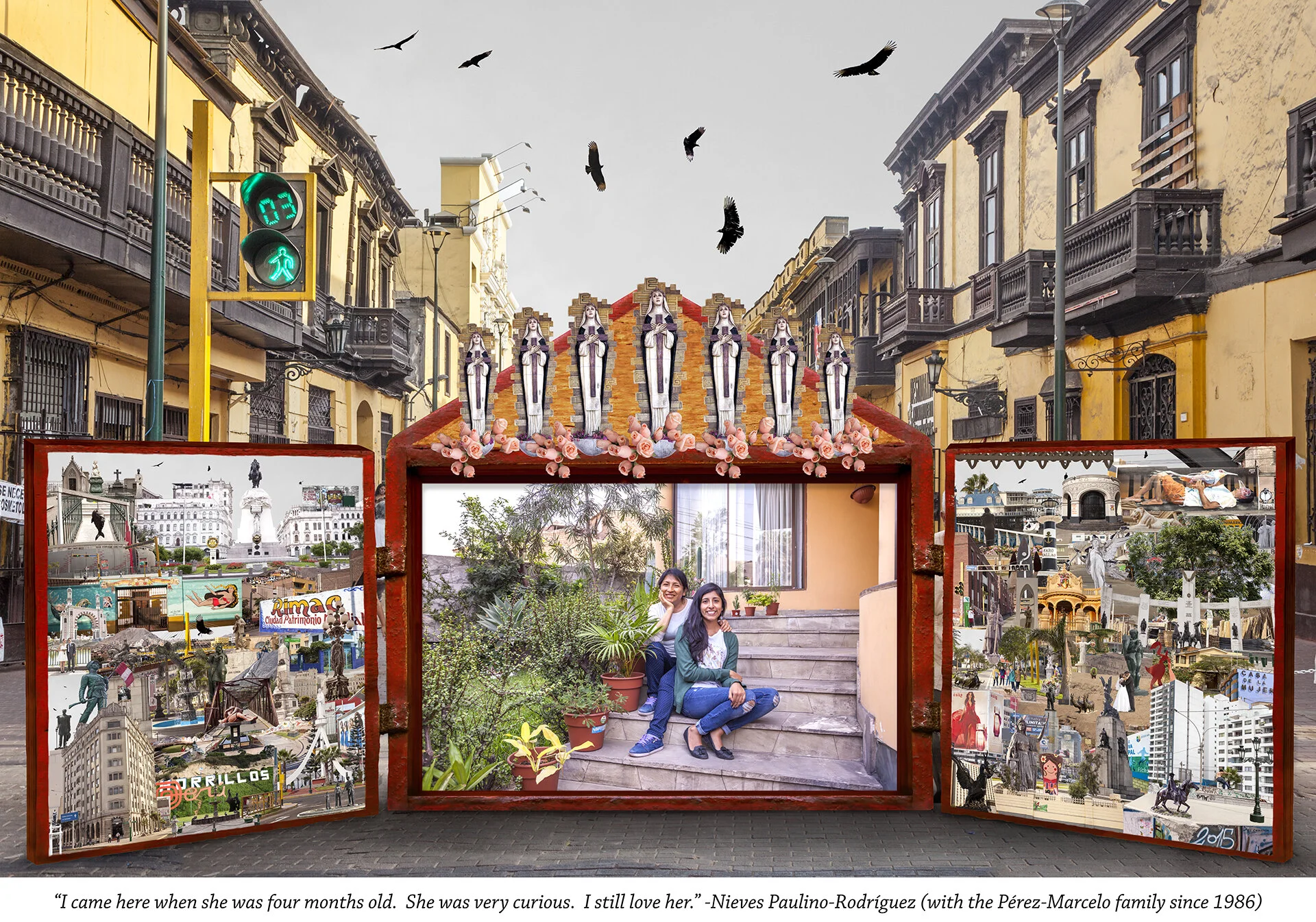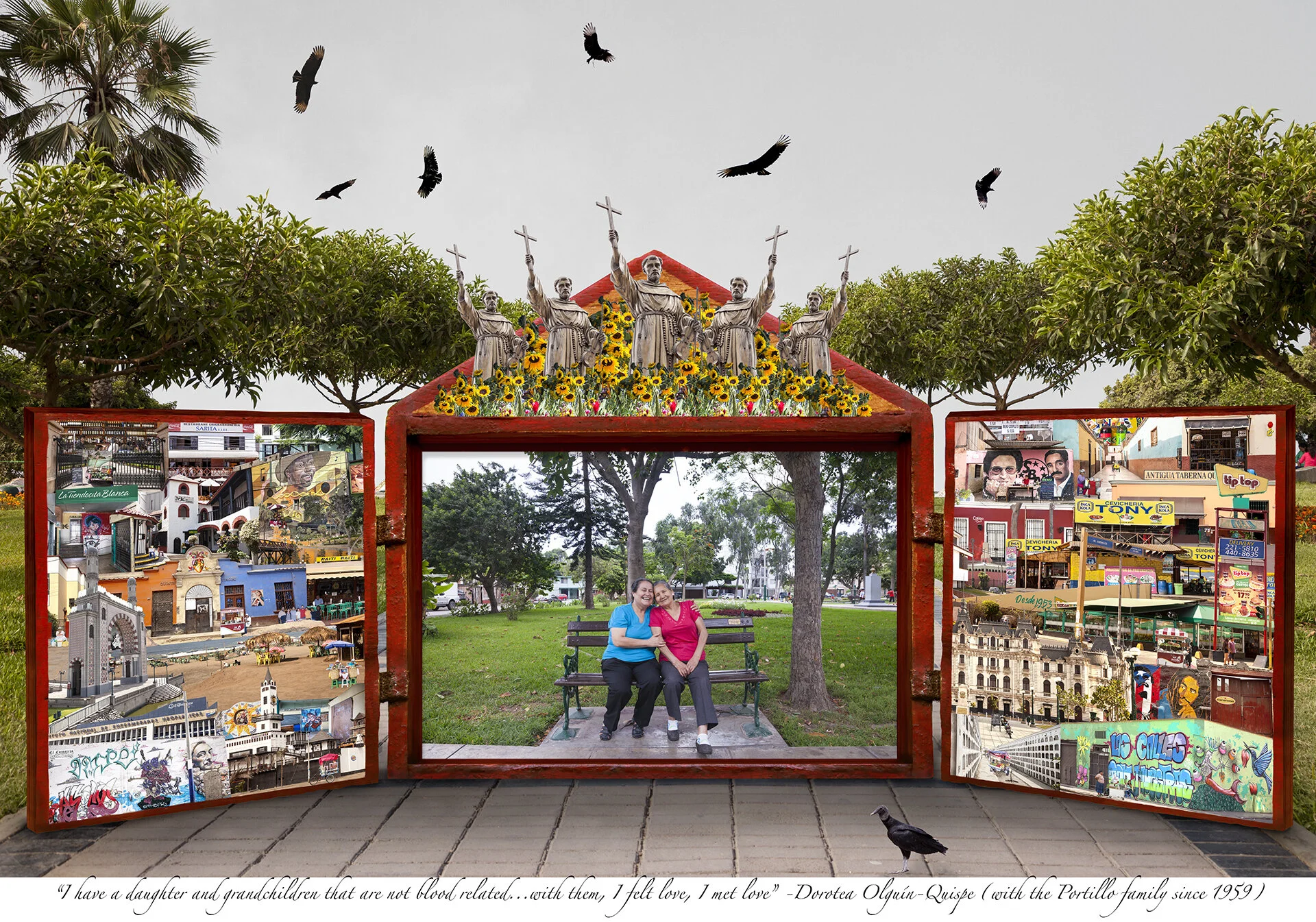 I reinvented the retablo as “Retablos of Lima” to present the caregivers and the children they helped to raise as iconic images of Lima. By focusing on these relationships the impact and importance of these women transcends what was meant to be an economical relationship. The result is an unbreakable bond, a maternal-filial love between two unrelated people that survives over the years and overcomes the conventions of social classes.